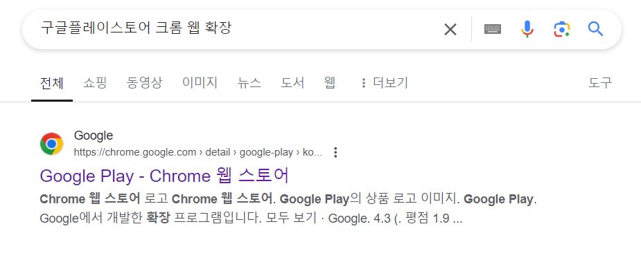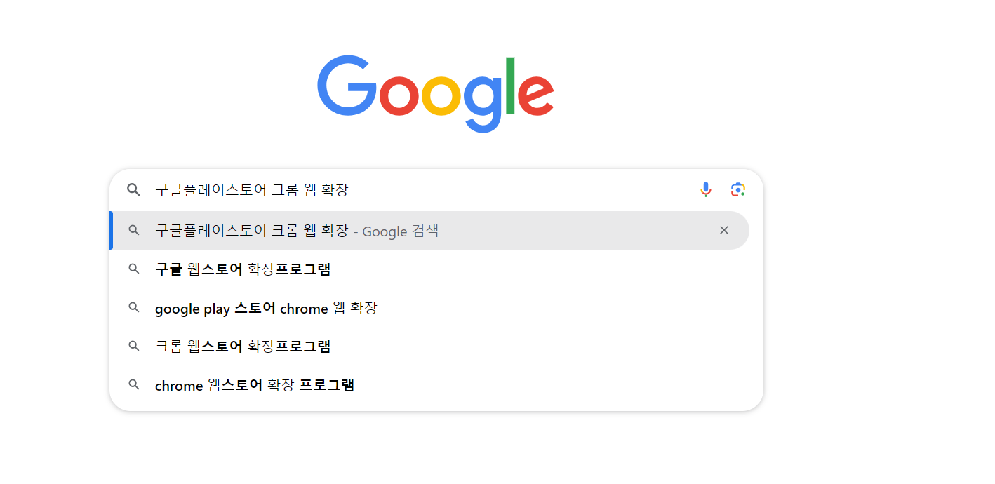 (2) 'Google 검색' 창에 "구글플레이스토어 크롬 웹 확장" 을 입력하고 엔터(ENTER)를 칩니다.