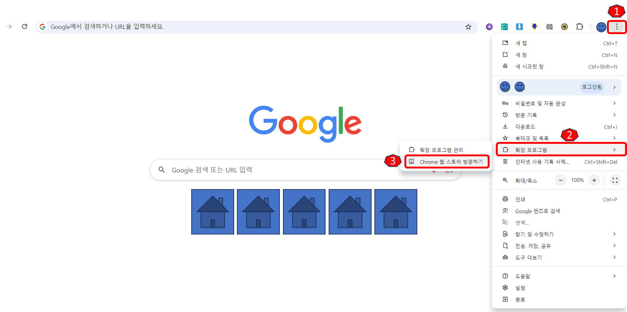 (6) 오른쪽 최상단의 세로로 된 3개의 점 버튼 클릭, 확장 프로그램, Chrome 웹 스토어 방문하기를 누릅니다.