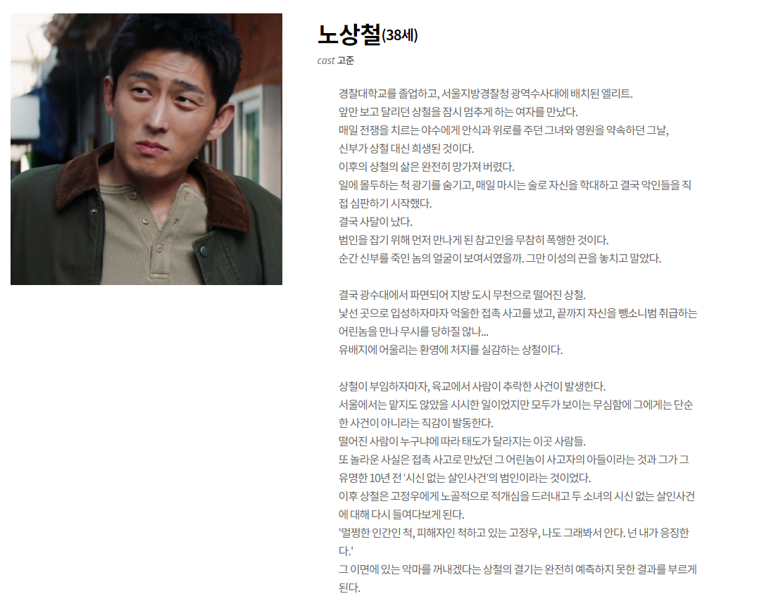 한편, 무천 경찰서로 내려온 형사 노상철(고준)은 고정우를 예의주시하며 그를 추적합니다. 사건의 실체를 파헤치는 과정에서 노상철은 "이게 말이 안 되는데"라고 말하며 11년 전 그날에 숨겨진 비밀이 있음을 암시합니다.