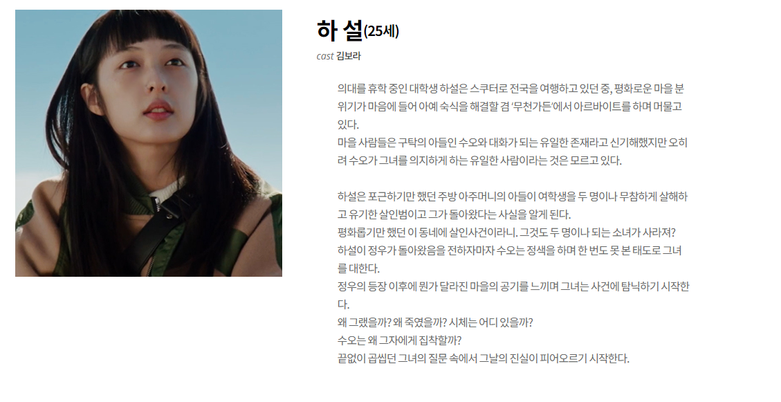마을의 수상한 분위기를 감지한 이방인 하설(김보라)도 단서를 찾기 위해 분주히 움직입니다. 모두가 무언가를 숨기고 있는 듯한 이 상황에서, 형사 노상철의 말처럼 "모두가 용의자"일 수 있다는 긴장감이 높아지고 있습니다.