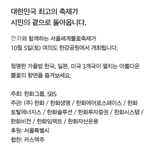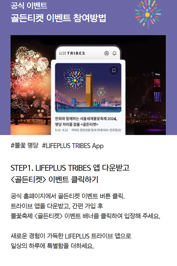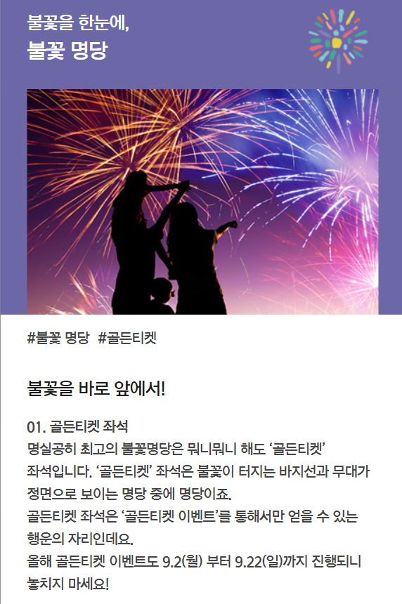 ★ 세계불꽃축제 공식 명당자리는 한화에서 진행하는 골든티켓 이벤트를 통해 예매하실 수 있습니다!